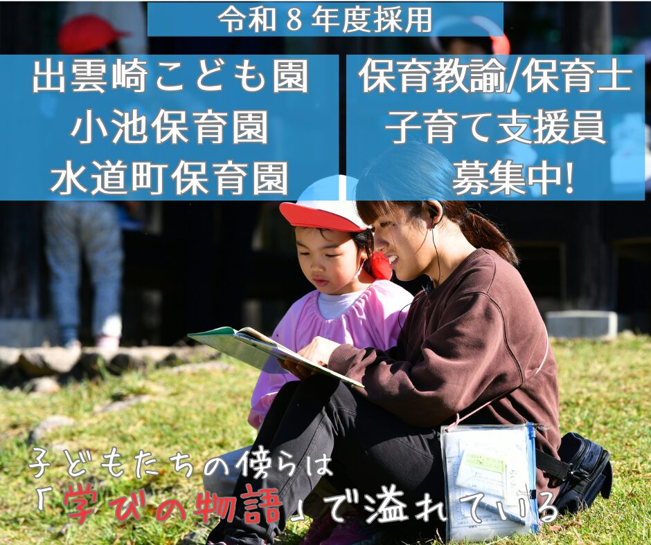 令和8年度に向け、「出雲崎こども園」「小池保育園(燕市)」、「水道町保育園(燕市)」の保育士、保育教諭、子育て支援員、を募集しております。